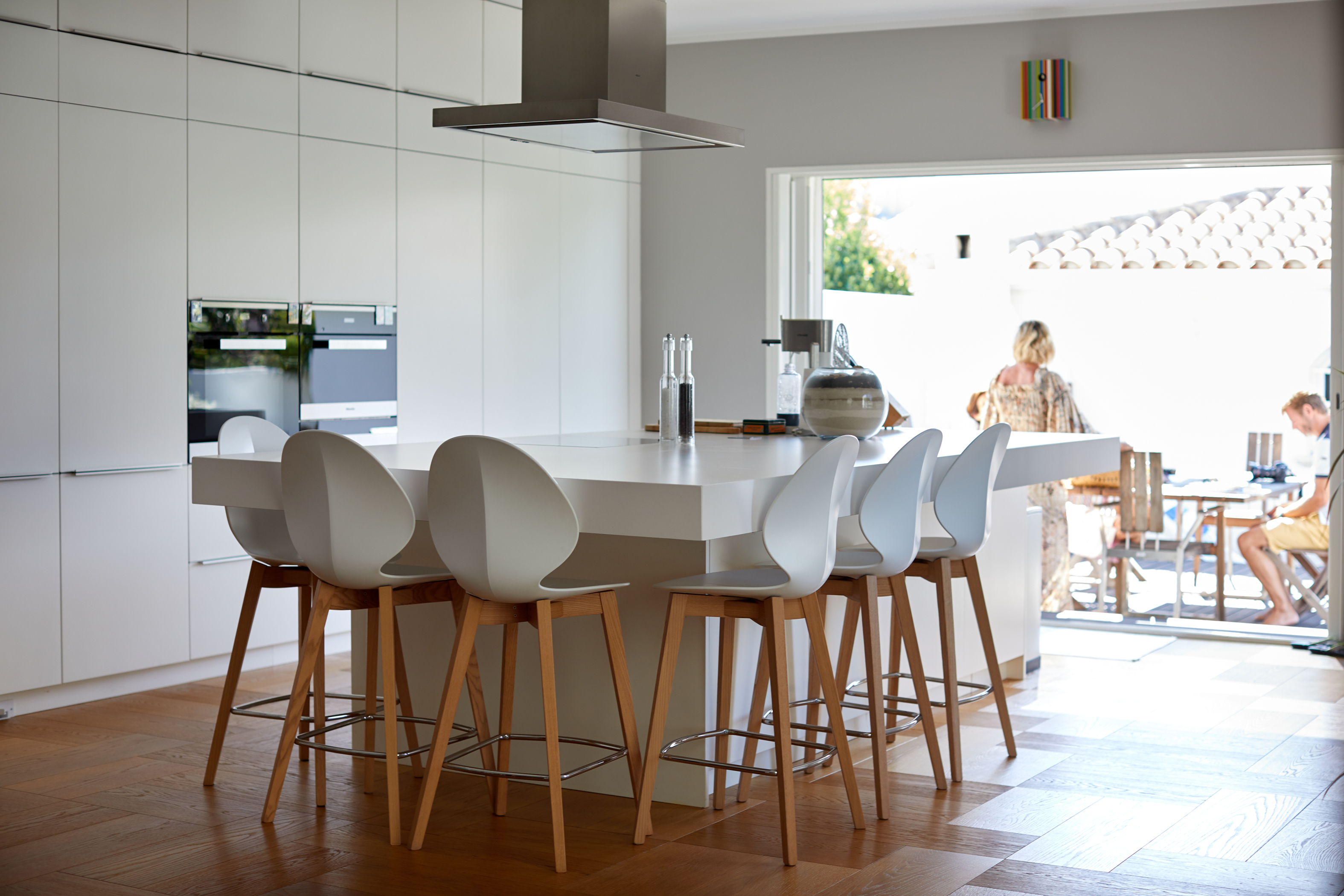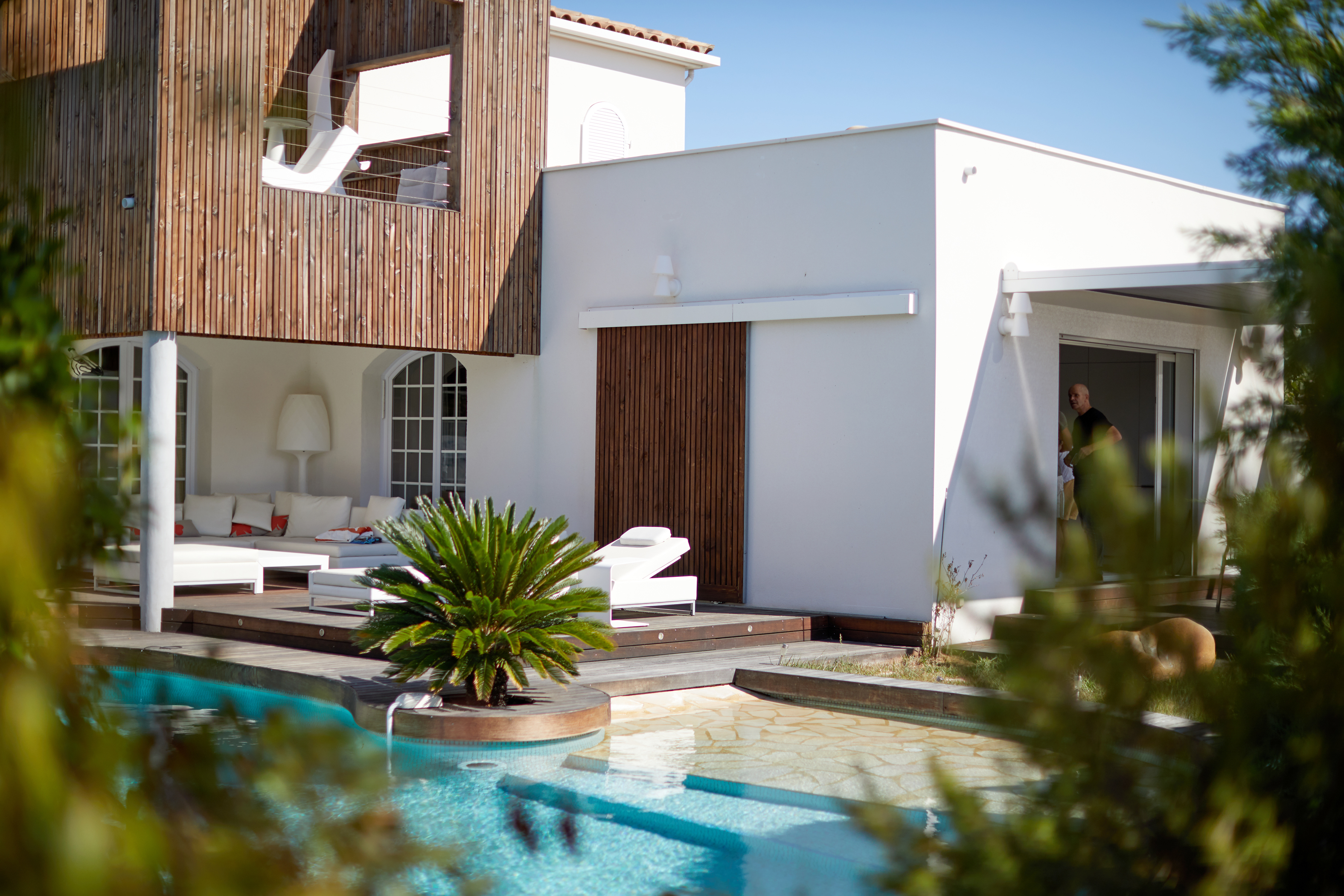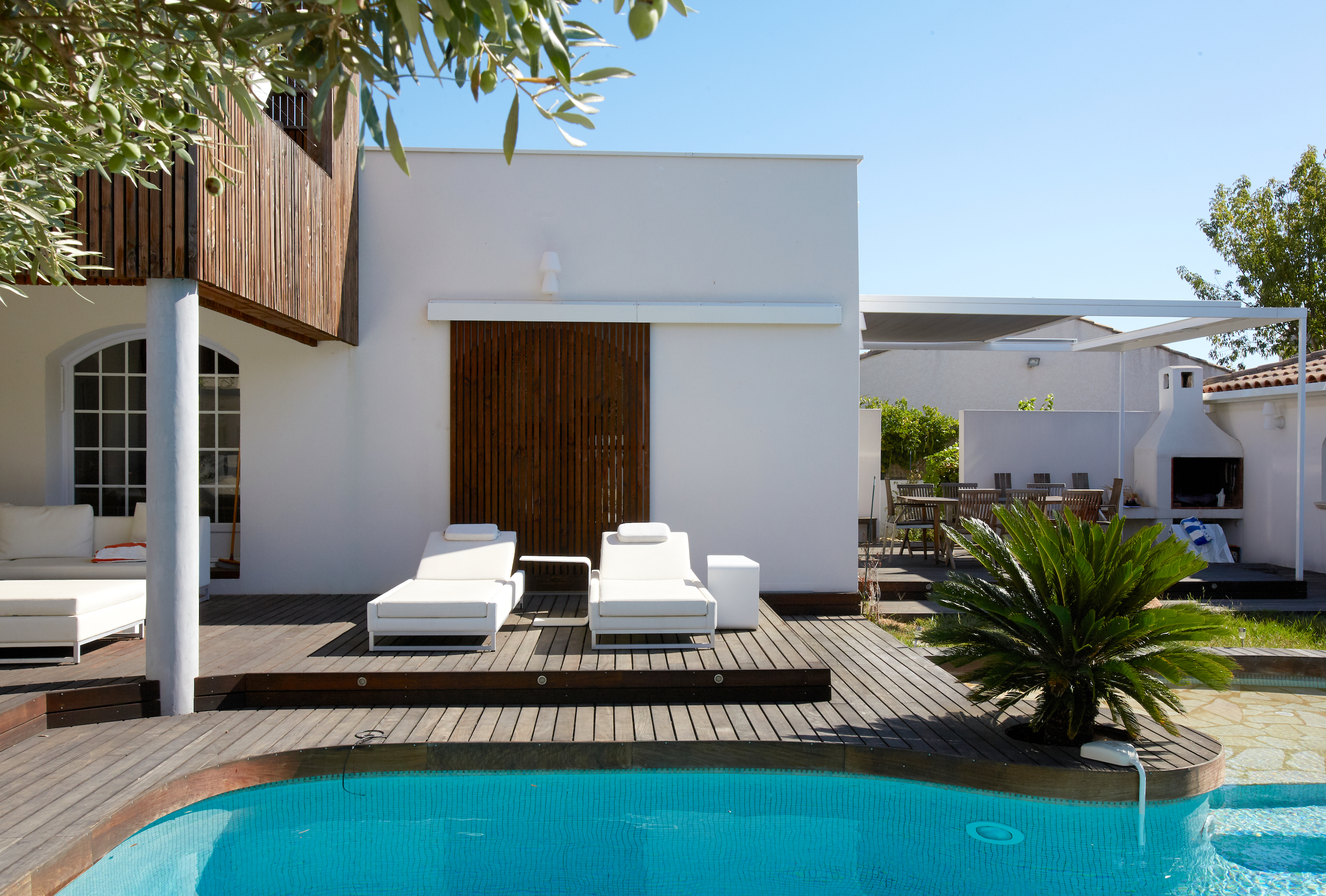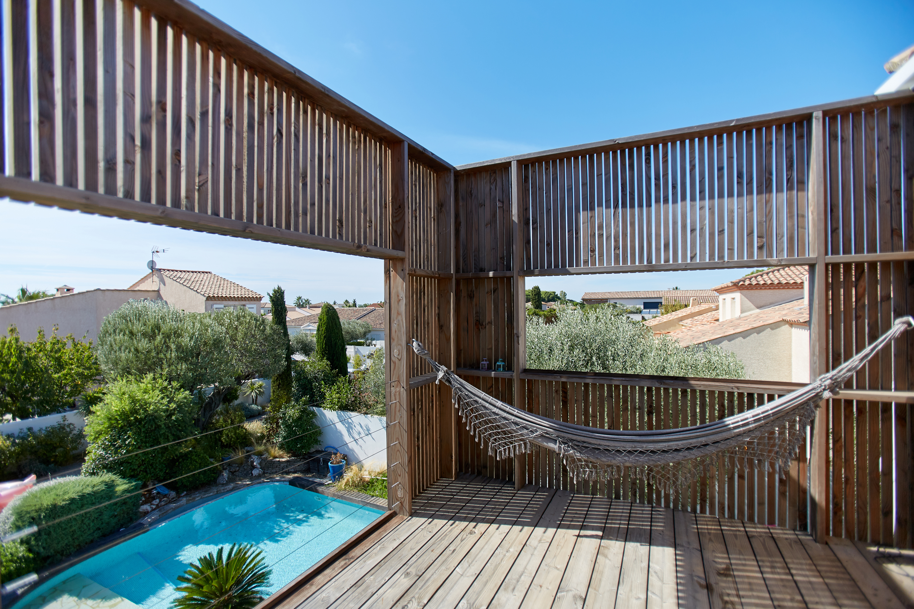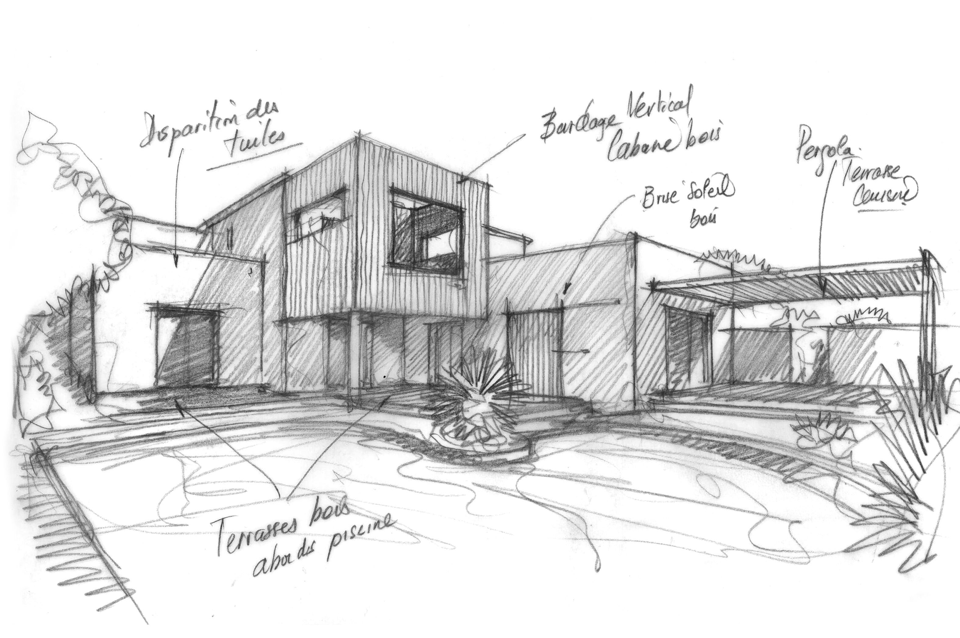 L'avant : datant des années 90, une pure languedocienne ! Arcs brisés, balustres béton, génoises et pomme de pin sur le toit… un style bien du midi. Une entrée qui se cherche, un besoin de terrasse ombragée. Les propriétaires y vivent depuis plus de 25 ans, ils y sont tès attaché mais veulent lui redonner un nouveau style. Envie d'une cave à vin, d'une grande cuisine et d'une terrasse en bois autour de la piscine. Sur ce projet le défi est délicat : répondre à toutes les envies sans exploser le budget. Une nouvelle apparence par une subtile intervention en toiture, acrotère et chenaux intégrés, la création d’une grande terrasse en lien direct avec la cuisine, et une terrasse à l'étage dans l’esprit d’une cabane.