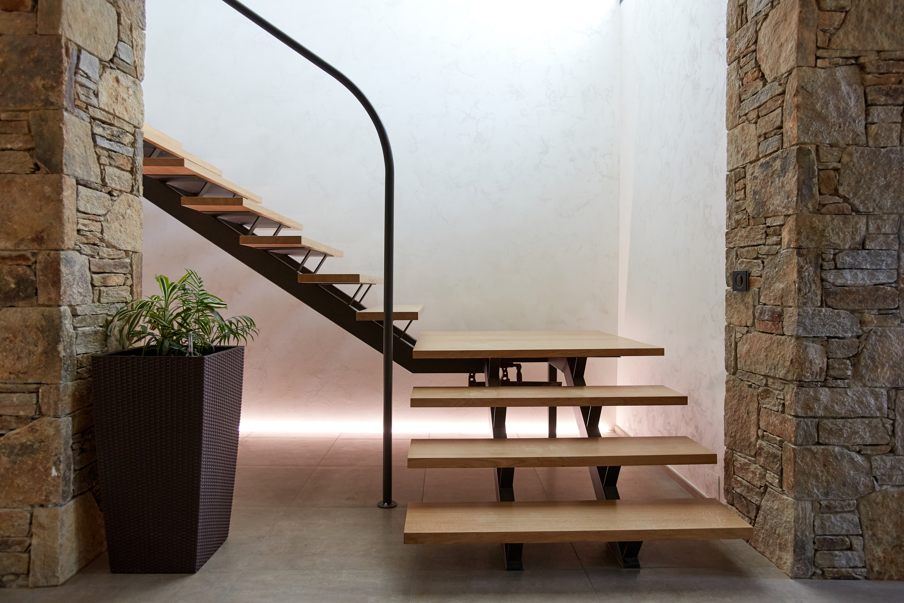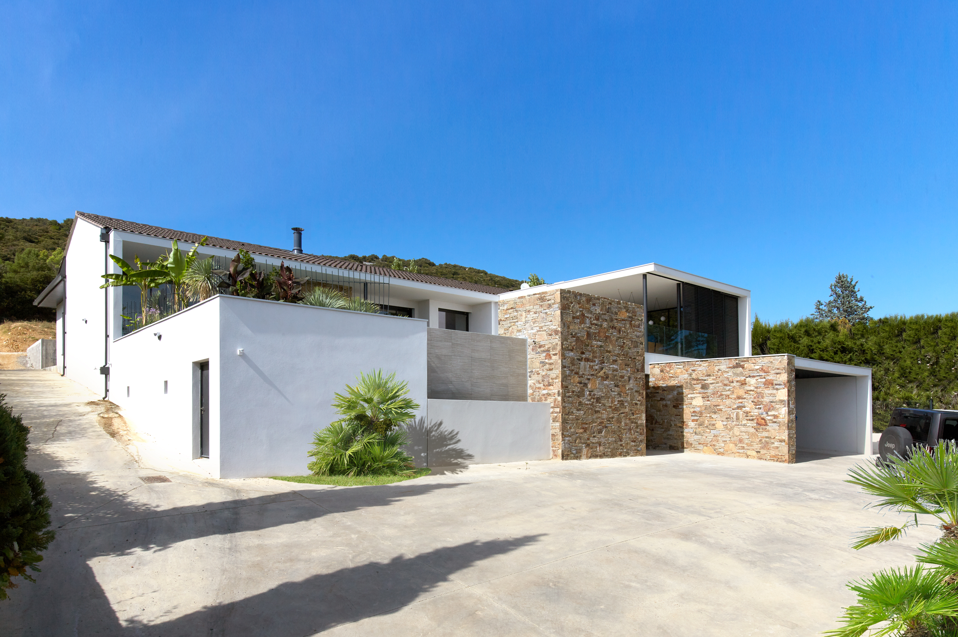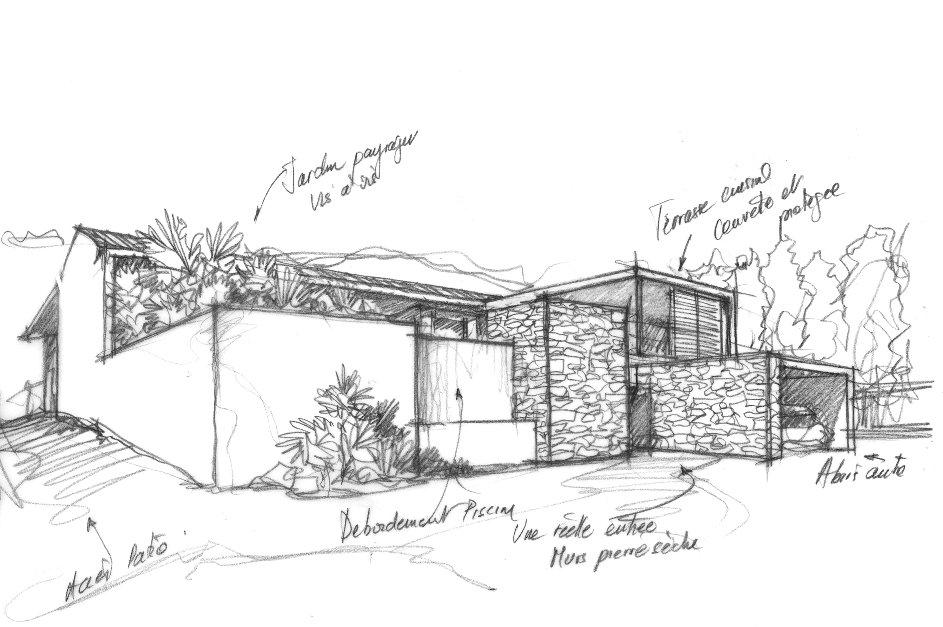 **L'avant :** habitée à peine quelques années puis abandonnée, elle est restée vacante. C’était une première maison pour les propriétaires, mais elle a été faite sans passion par un maître-d’oeuvre. Et ça ne fonctionnait pas, avec des incohérences en terme d’ergonomie et d’habitabilité, des malformations structurelles et une organisation spatiale à revoir… bref, elle a besoin qu’on s’occupe d’elle ! Puisqu’elle est adossée à une colline, les propriétaires souhaitaient lui redonner l’usage de la campagne en facilitant l’accès aux chevaux logés en léger surplomb de la maison. **Le projet :** la découverte d’un espace délaissé en sous-sol permet la création d’une salle de cinéma. Le garage est transformé en cuisine. Et même une deuxième cuisine est créée pour préparer les repas de famille. Là, un joli patio planté donne de l’air dans l’intimité. Ici, un bel escalier et une belle entrée. Une seconde vie de plaisir, de lumière, de confort…