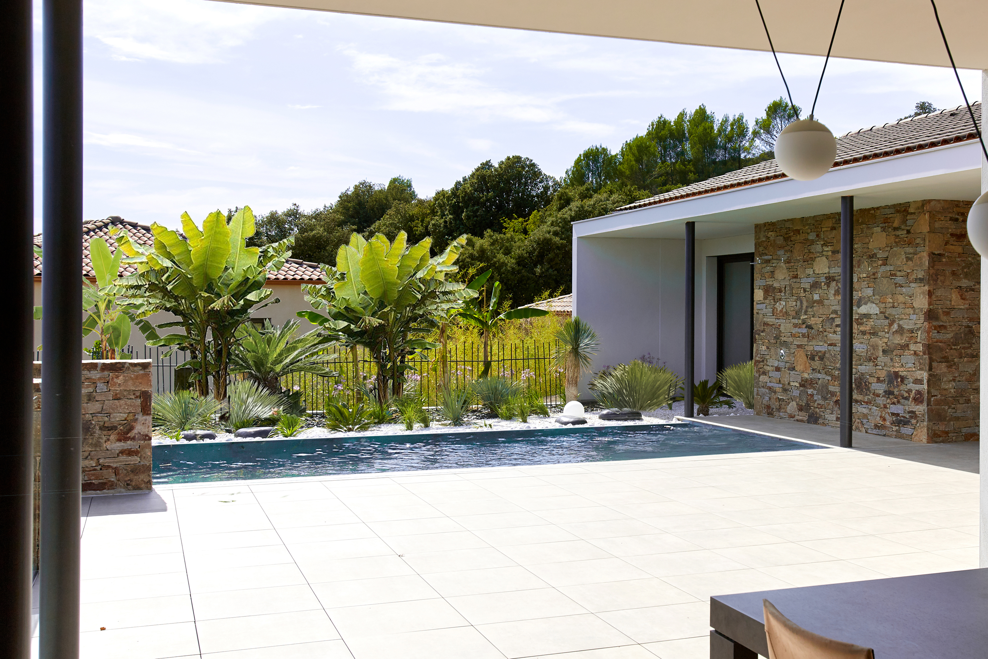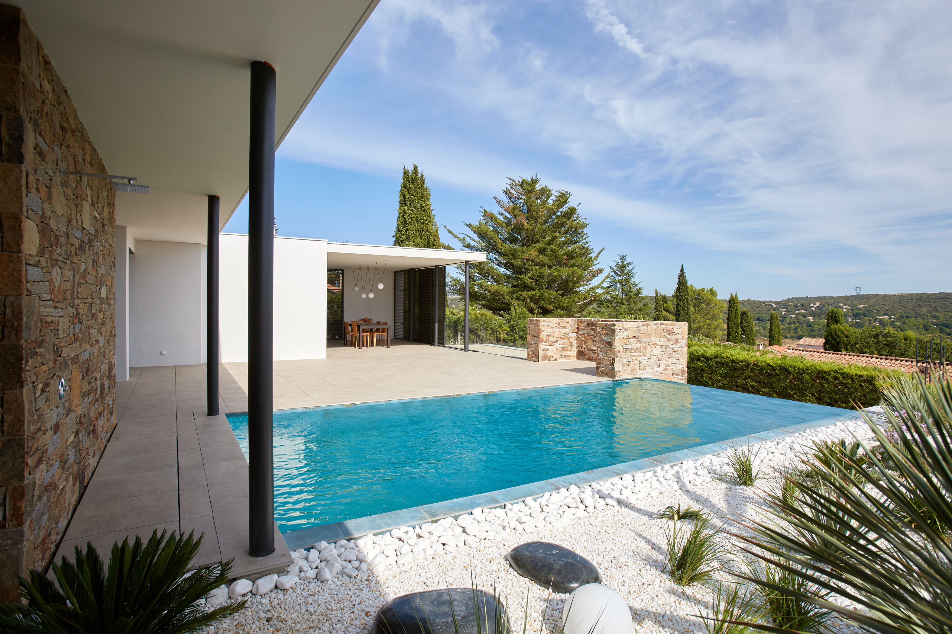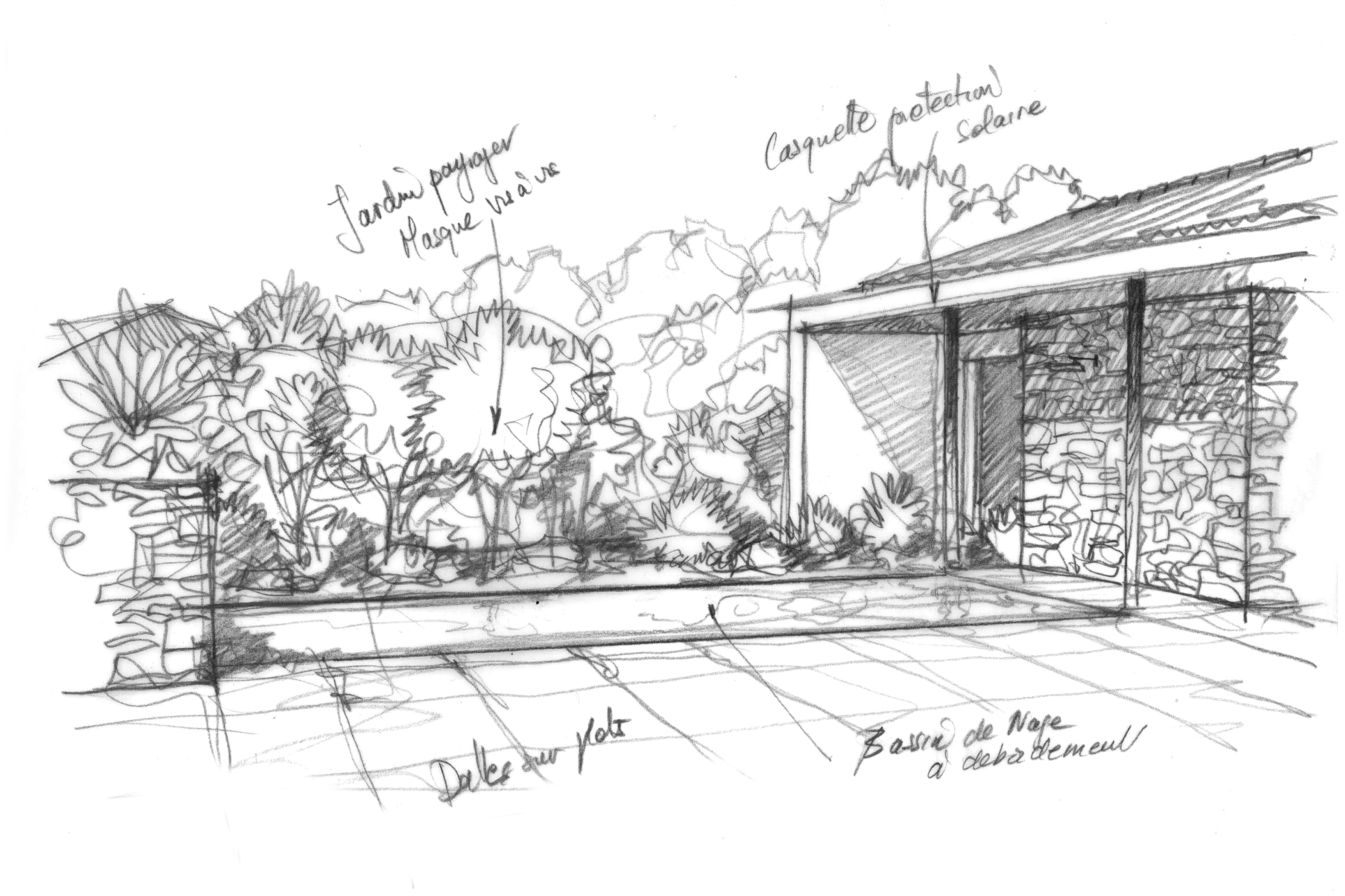 **L'avant :** habitée à peine quelques années puis abandonnée, elle est restée vacante. C’était une première maison pour les propriétaires, mais elle a été faite sans passion par un maître-d’oeuvre. Et ça ne fonctionnait pas, avec des incohérences en terme d’ergonomie et d’habitabilité, des malformations structurelles et une organisation spatiale à revoir… bref, elle a besoin qu’on s’occupe d’elle ! Puisqu’elle est adossée à une colline, les propriétaires souhaitaient lui redonner l’usage de la campagne en facilitant l’accès aux chevaux logés en léger surplomb de la maison. **Le projet :** la découverte d’un espace délaissé en sous-sol permet la création d’une salle de cinéma. Le garage est transformé en cuisine. Et même une deuxième cuisine est créée pour préparer les repas de famille. Là, un joli patio planté donne de l’air dans l’intimité. Ici, un bel escalier et une belle entrée. Une seconde vie de plaisir, de lumière, de confort…
